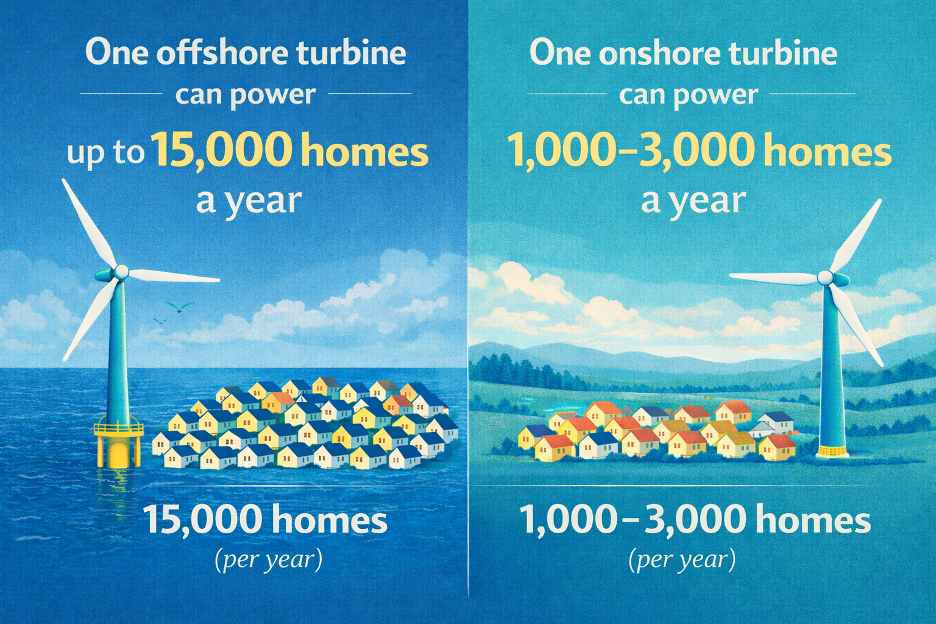 One offshore turbine can power up to 15,000 homes a year, compared with 1,000-3,000 homes for a single onshore turbine (U.S. Department of Energy).
